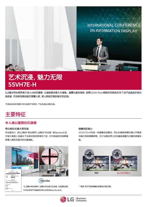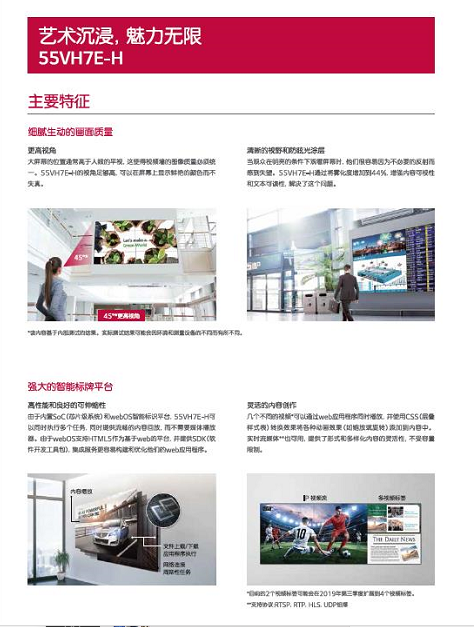 产品描述:0.9毫米窄边带来打动人心的沉浸感,让回面真实感大为增强。高雾化度的表面,使得55VH7E-H即使在明亮的灯光下也不会造成外部兴线反射,并且能有效地吸引观看人群,将人群吸引到安装它的区域。