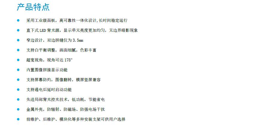 产品描述:该产品 是宇视面向商业用户推出的 窄边 LCD 拼接显示 单元,采用工业级面板高可靠性一体化设计具备丰富的视频输入 接口和 业