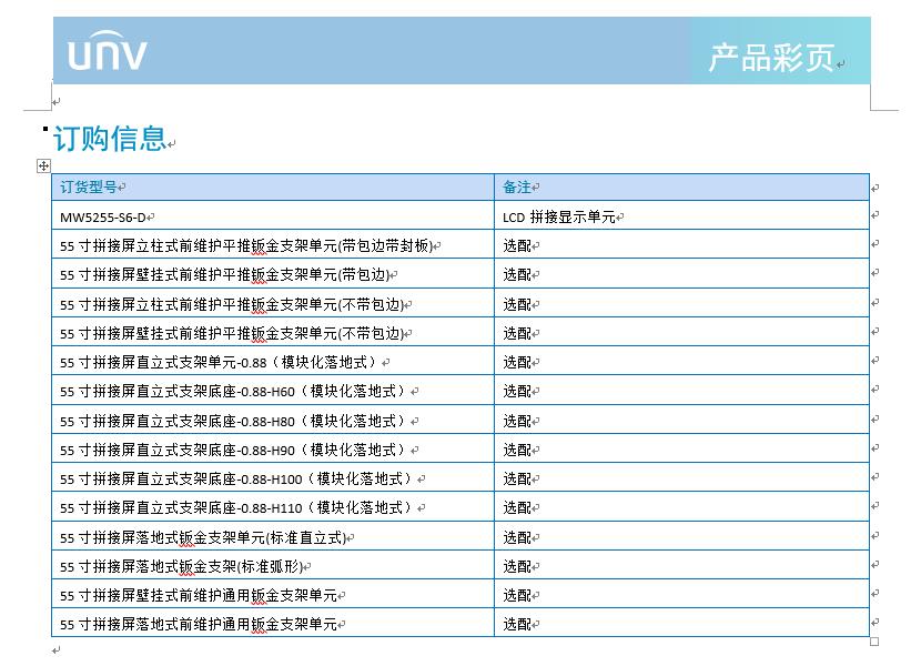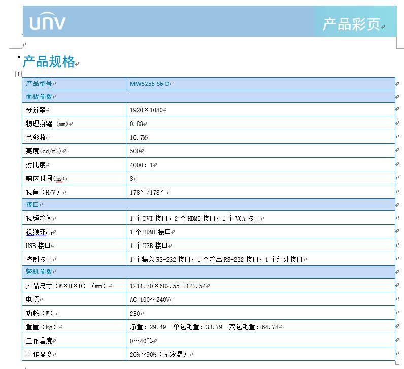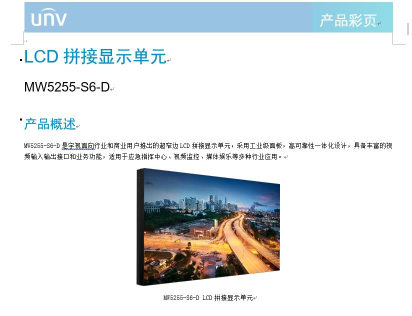 产品描述:MW5255-S6-D是宇视面向行业和商业用户推出的超窄边LCD拼接显示单元,采用工业级面板,高可靠性一体化设计,具备丰富的视频输入输出接口和业务功能,适用于应急指挥中心、视频监控、媒体娱乐等多种行业应用。