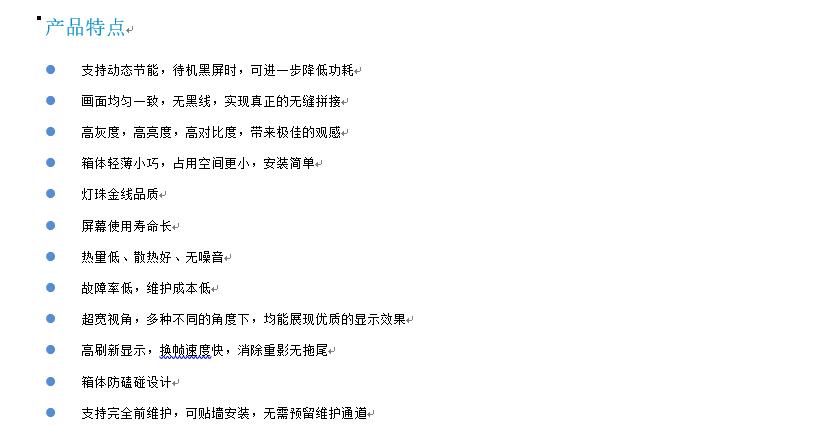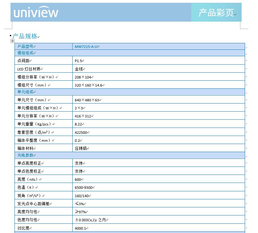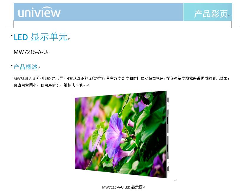 产品描述:MW7215-A-U系列LED显示屏,可实现真正的无缝拼接,具有超高亮度和对比度及超宽视角,在多种角度均能获得优质的显示效果,且占用空间小,使用寿命长,维护成本低。