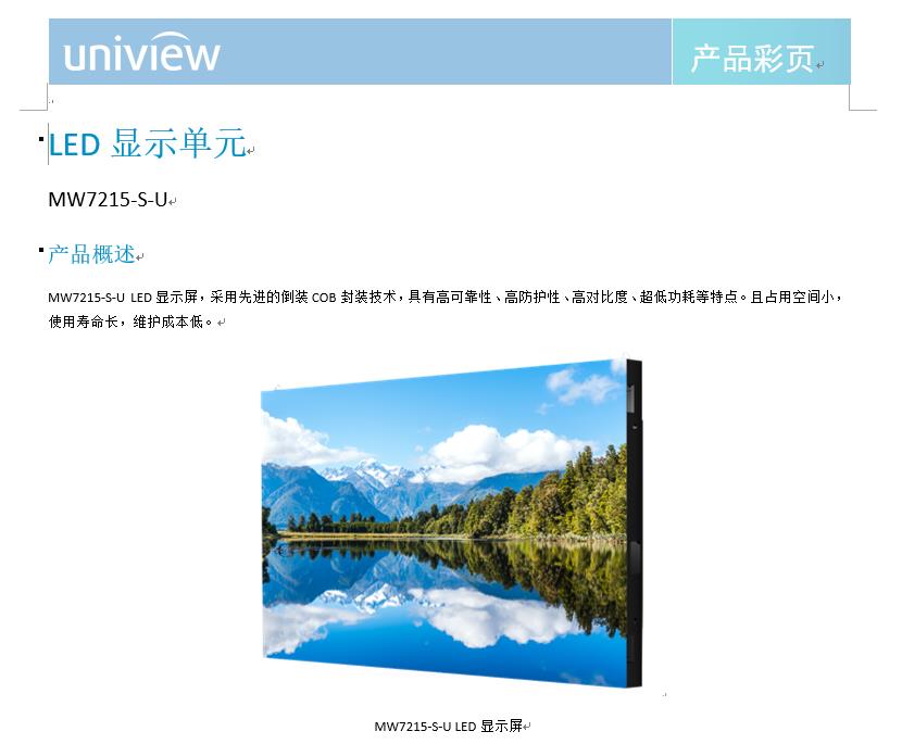 产品描述:MW7215-S-U LED显示屏,采用先进的倒装COB封装技术,具有高可靠性、高防护性、高对比度、超低功耗等特点。且占用空间小,使用寿命长,维护成本低。