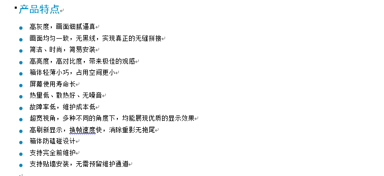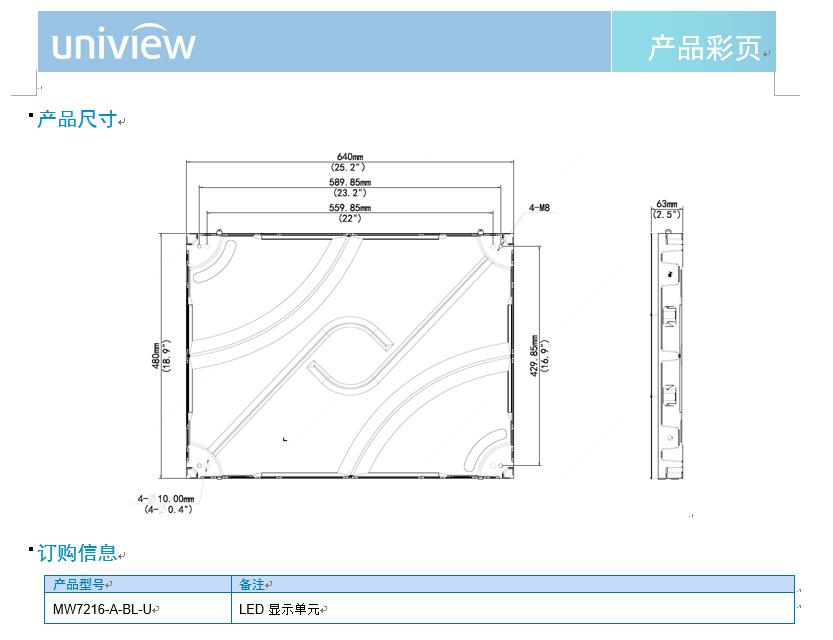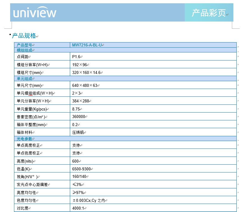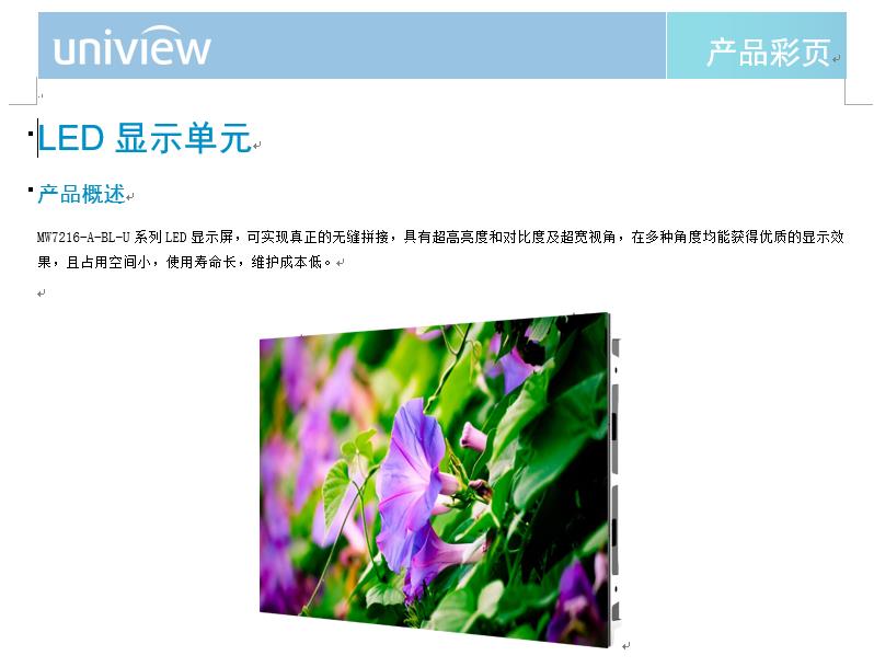 产品描述:MW7216-A-BL-U系列LED显示屏,可实现真正的无缝拼接,具有超高亮度和对比度及超宽视角,在多种角度均能获得优质的显示效果,且占用空间小,使用寿命长,维护成本低。
