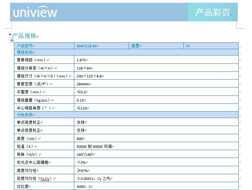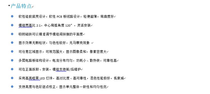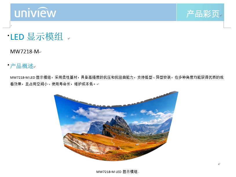 产品描述:MW7218-M LED显示模组,采用柔性基材,具备高强度的抗压和抗扭曲能力,支持弧型、异型安装,在多种角度均能获得优质的观看效果,且占用空间小、使用寿命长,维护成本低。