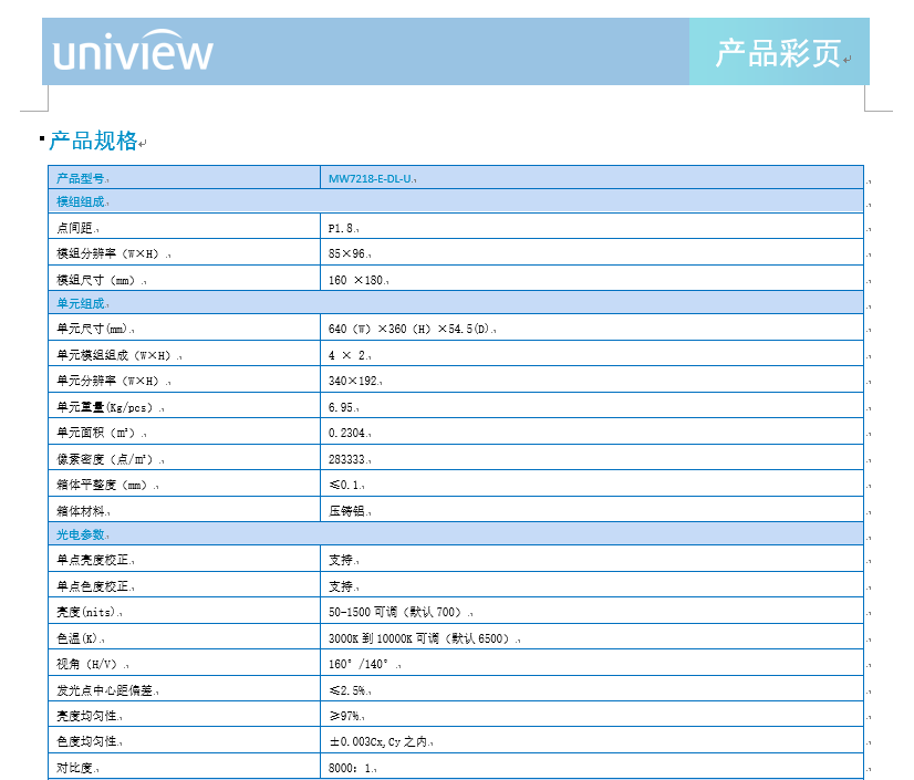 产品描述:MW7218-E-DL-U LED显示屏,可实现真正的无缝拼接,具有超高亮度和对比度及超宽视角,在多种角度均能获得优质的显示效果,且占用空间小,使用寿命能达10万小时,维护成本低。