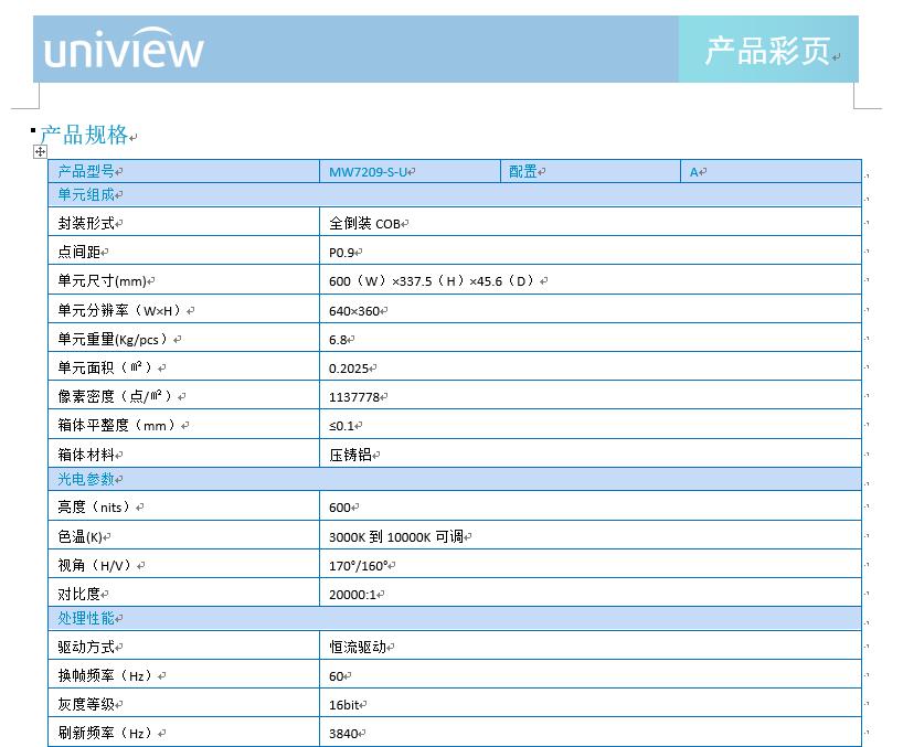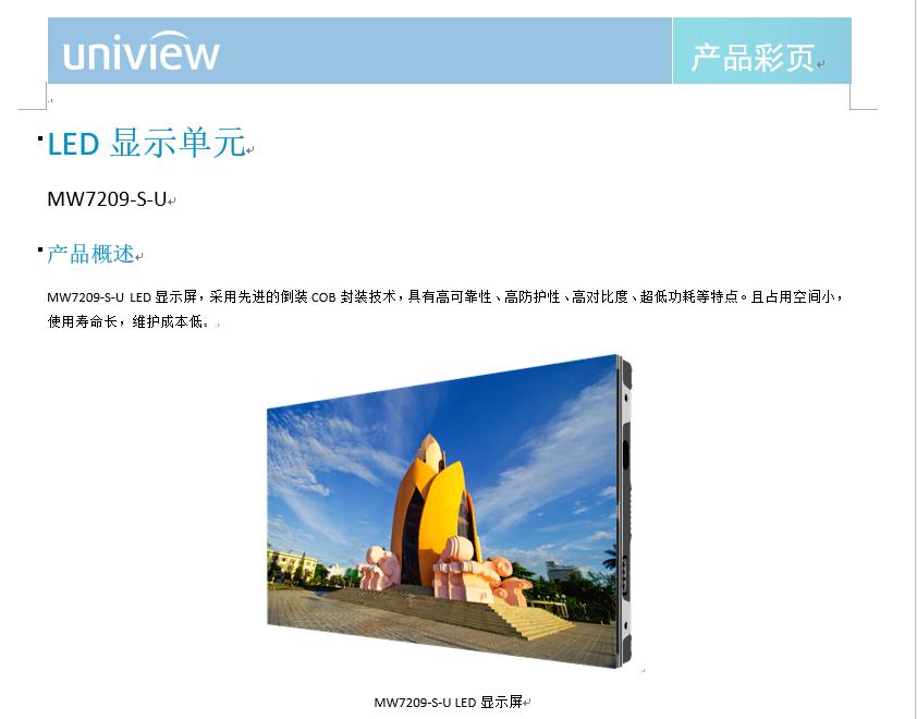 产品描述:MW7209-S-U LED显示屏,采用先进的倒装COB封装技术,具有高可靠性、高防护性、高对比度、超低功耗等特点。且占用空间小,使用寿命长,维护成本低。