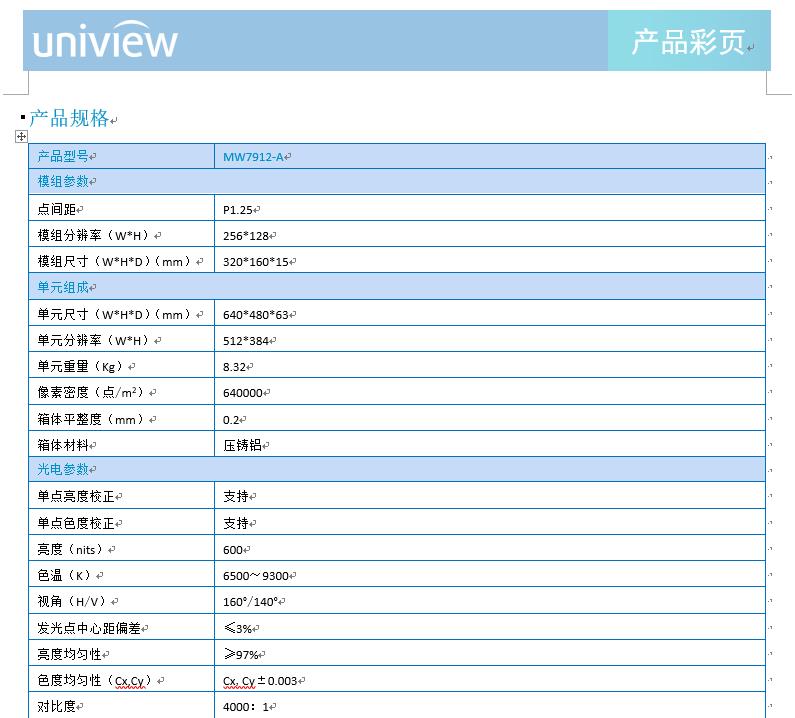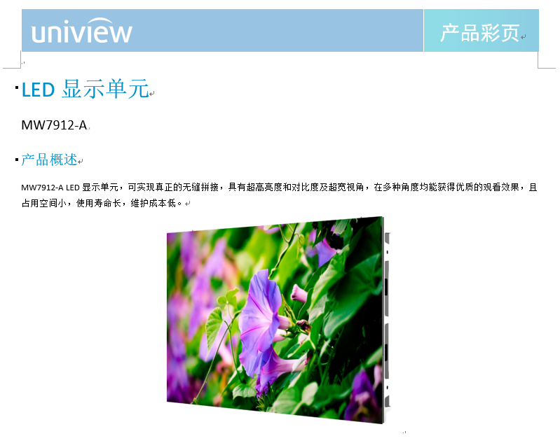 产品描述:MW7912-A LED显示单元,可实现真正的无缝拼接,具有超高亮度和对比度及超宽视角,在多种角度均能获得优质的观看效果,且占用空间小,使用寿命长,维护成本低。