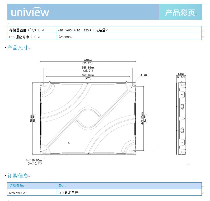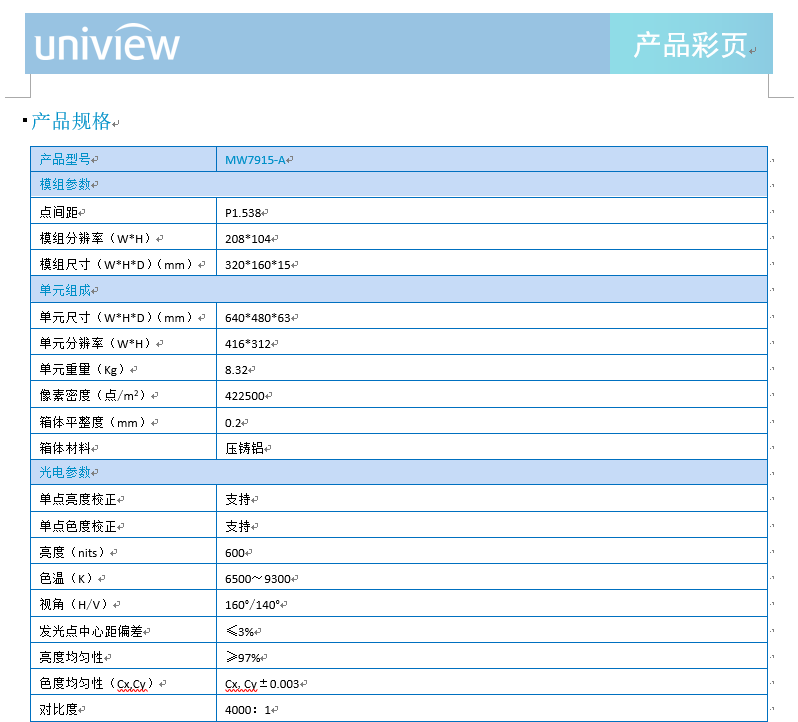 产品描述:MW7915-A LED显示单元,可实现真正的无缝拼接,具有超高亮度和对比度及超宽视角,在多种角度均能获得优质的观看效果,且占用空间小,使用寿命长,维护成本低。
