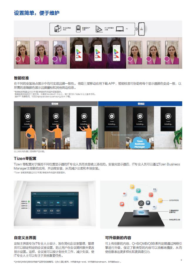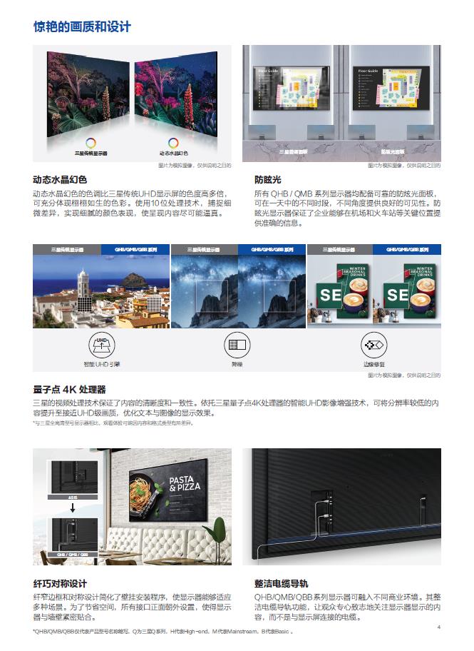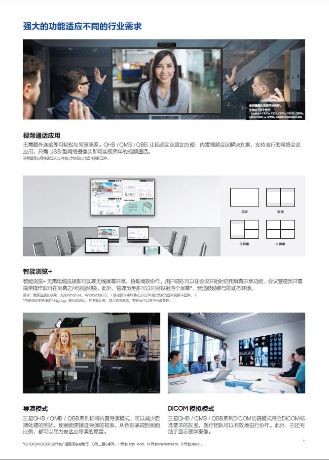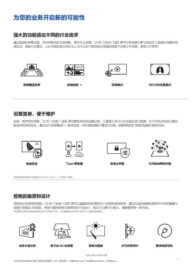 产品描述:QHB / QMB / QBB 系列可利用便于参与的协作工具提供流畅的视 频会议。以逼真的色彩提供令人惊艳的视觉效果,通过先进的视频处理技术可将低像素内容提升到接近 4K画质。凭借可靠的防眩光面板和抗干扰设计,观众可以集中注意力,清晰看到每一条内容。