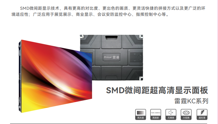 产品描述:雷霆KC系列采用SMD微间距显示技术,具有更高的对比度、更出色的画质、更灵活快捷的拼接方式以及更广泛的环境适应性;广泛应用于展览展示、商业显示、会议安防监控中心、指挥控制中心等。